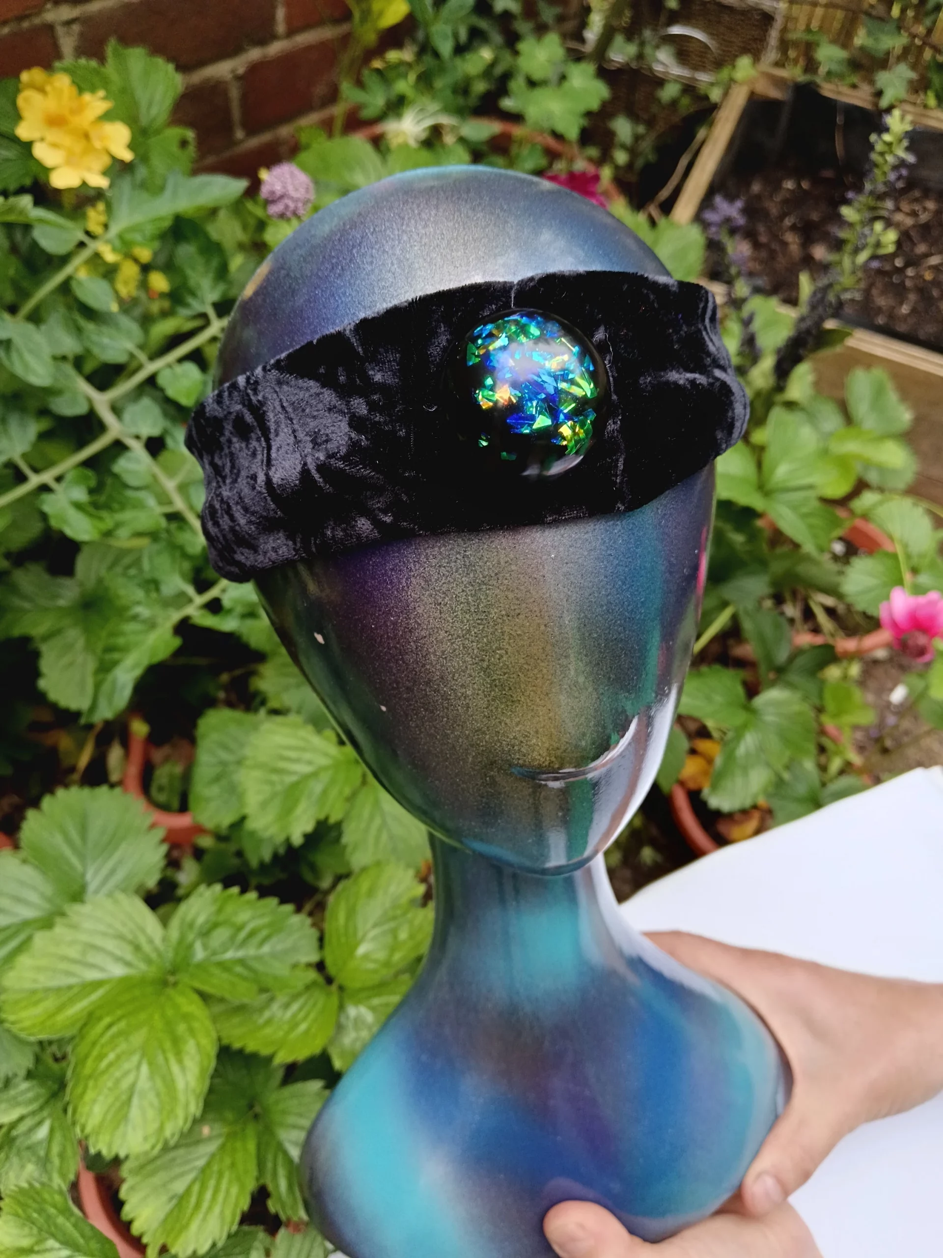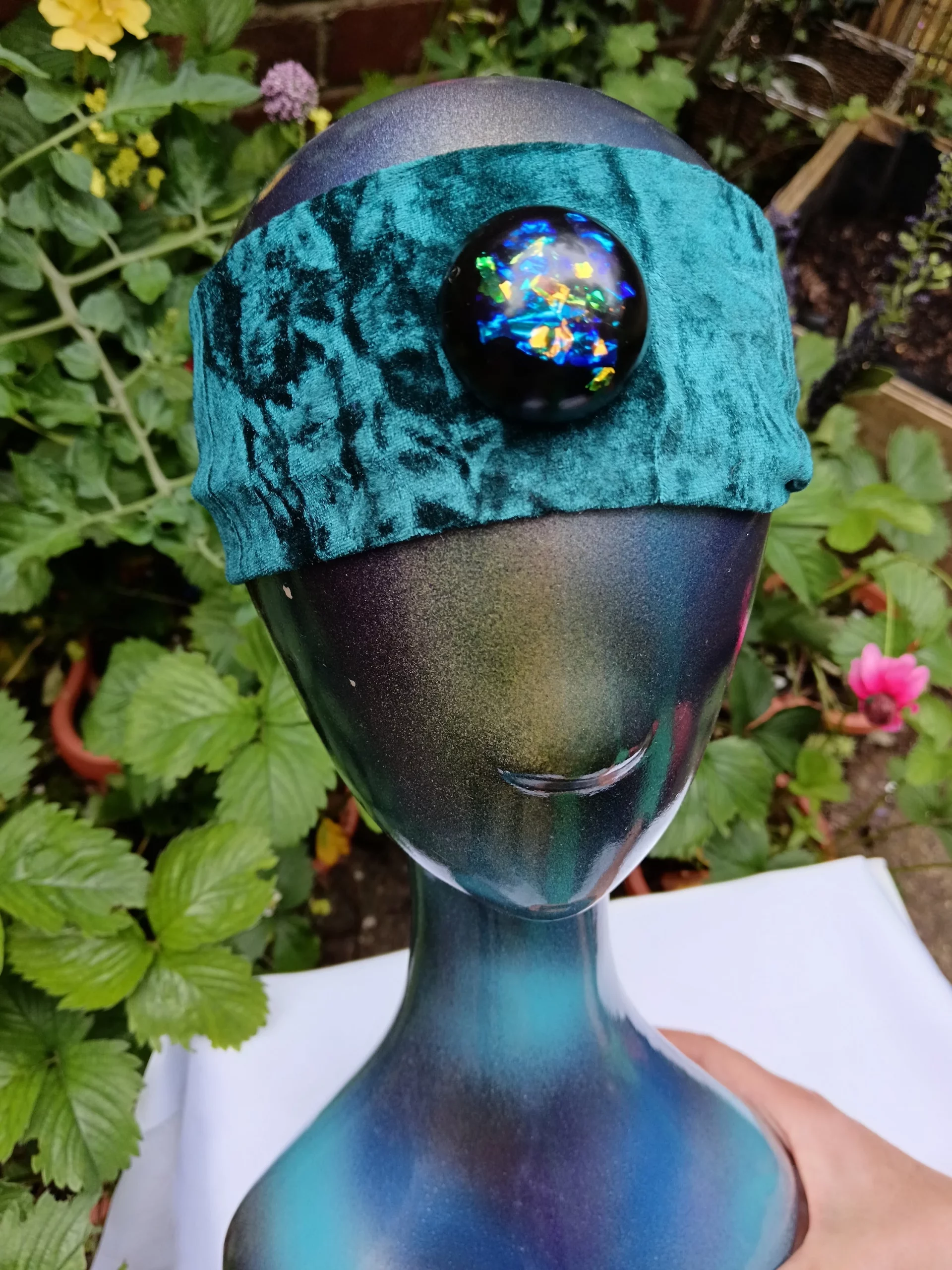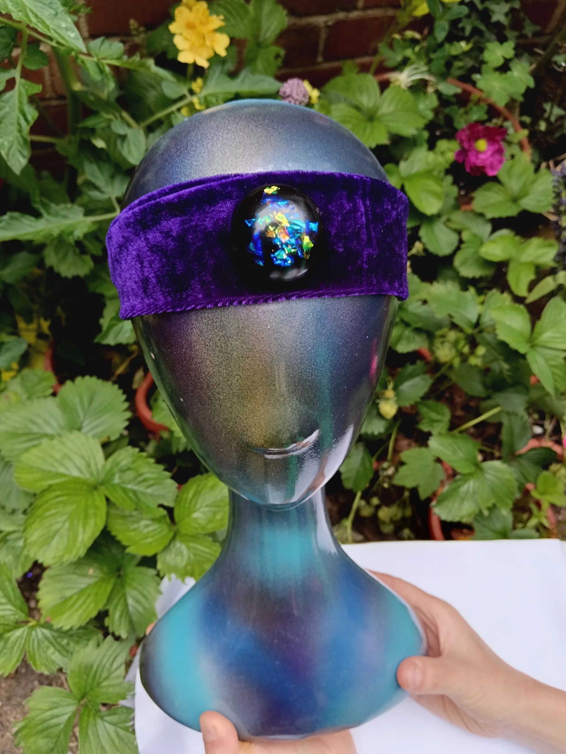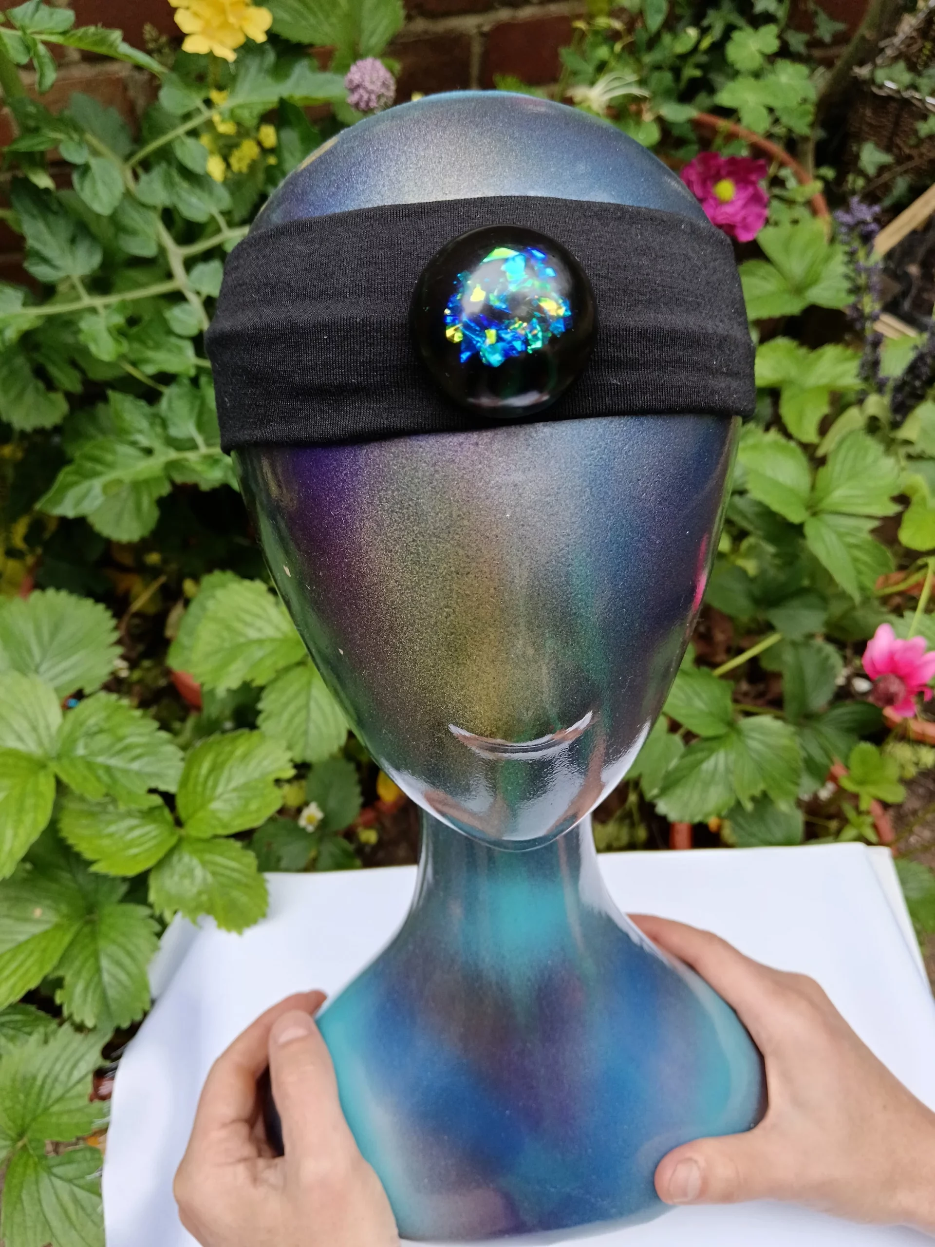 Oraphim Domes on a Headband with added silver saturated and Elite Shungite powder mix, Especially convenient for using during mediation as you can easily wear it with the Shungite dome on your 3rd eye/forehead area and feel your whole energy field expand immediately, the shungite dome it attached via a Velcro section so easy to remove for washing the headband.