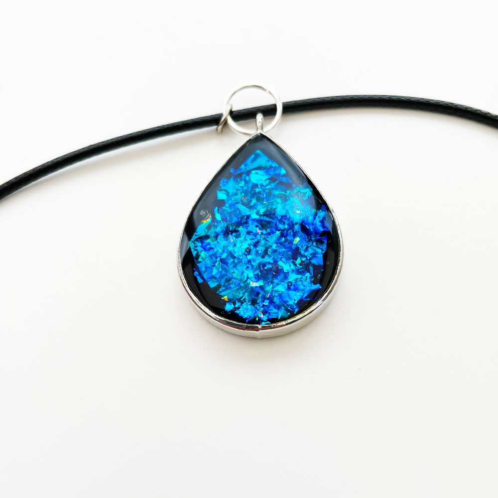 The pieces are in an alloy setting 25mm x 35mm. With a 50cm waxed cord necklace.