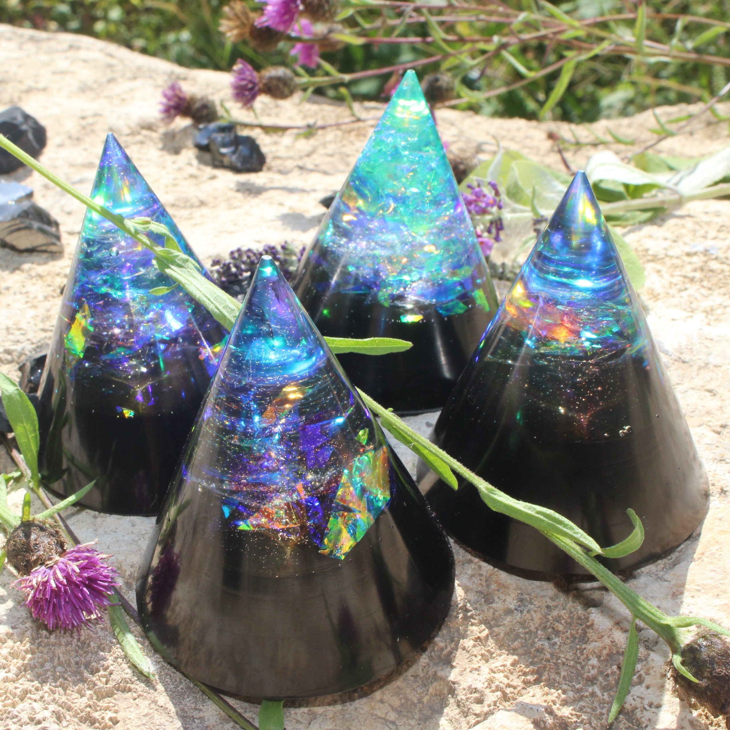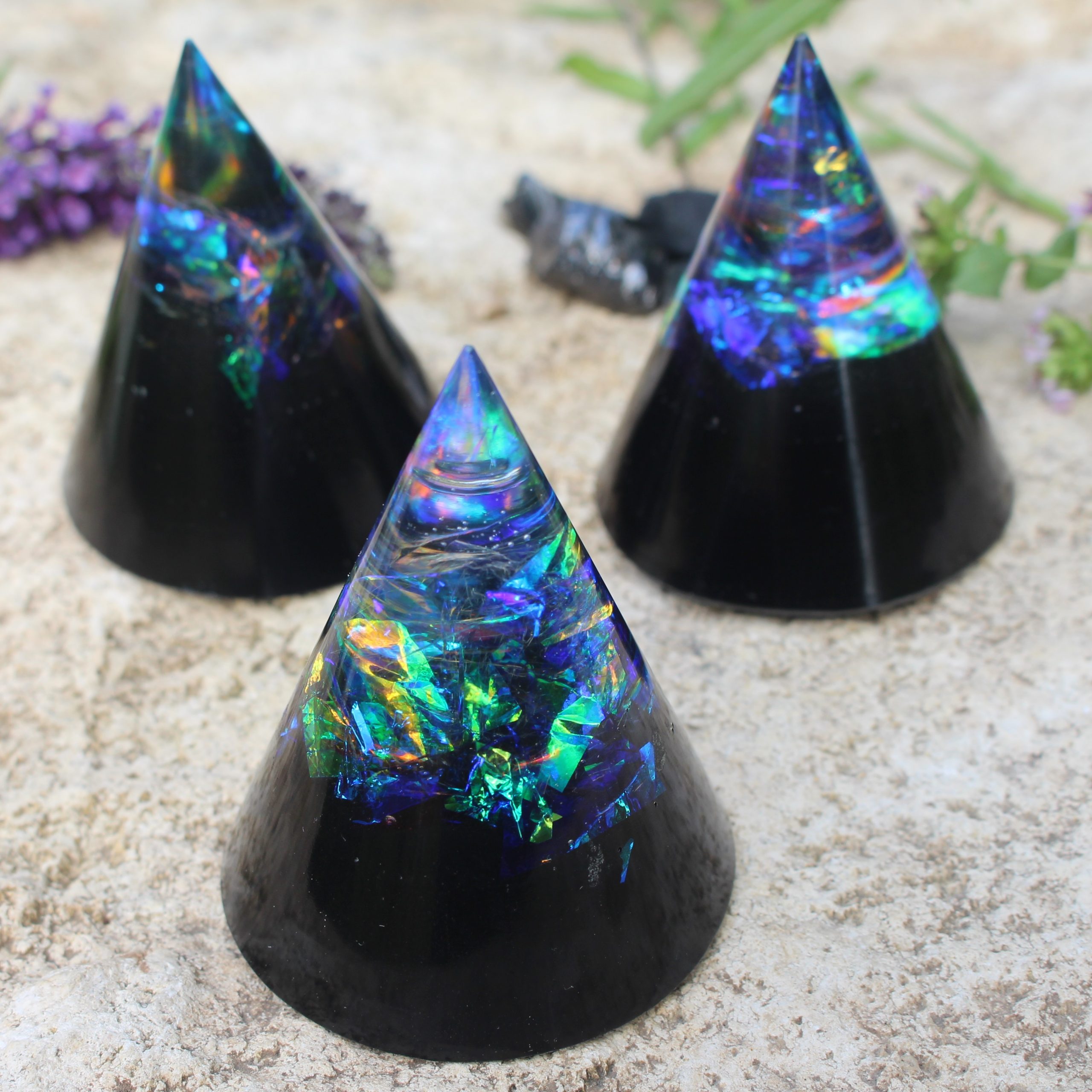Gift Boxed and Beautiful Calming & Healing Cones Size: 6.5cm Tall with a base of 5cm base sides: Mesmerizing and Powerful Quantum Meditating Aids, a true work of love and art, handmade by Oraphim, the Silver Infused Shungite powder is in the base of the pyramid with the dichroic decoration in the top, these are cast in resin. Pop two through checkout and we automatically add your 3rd in for free.