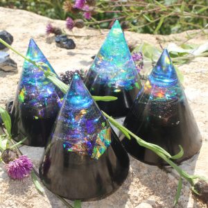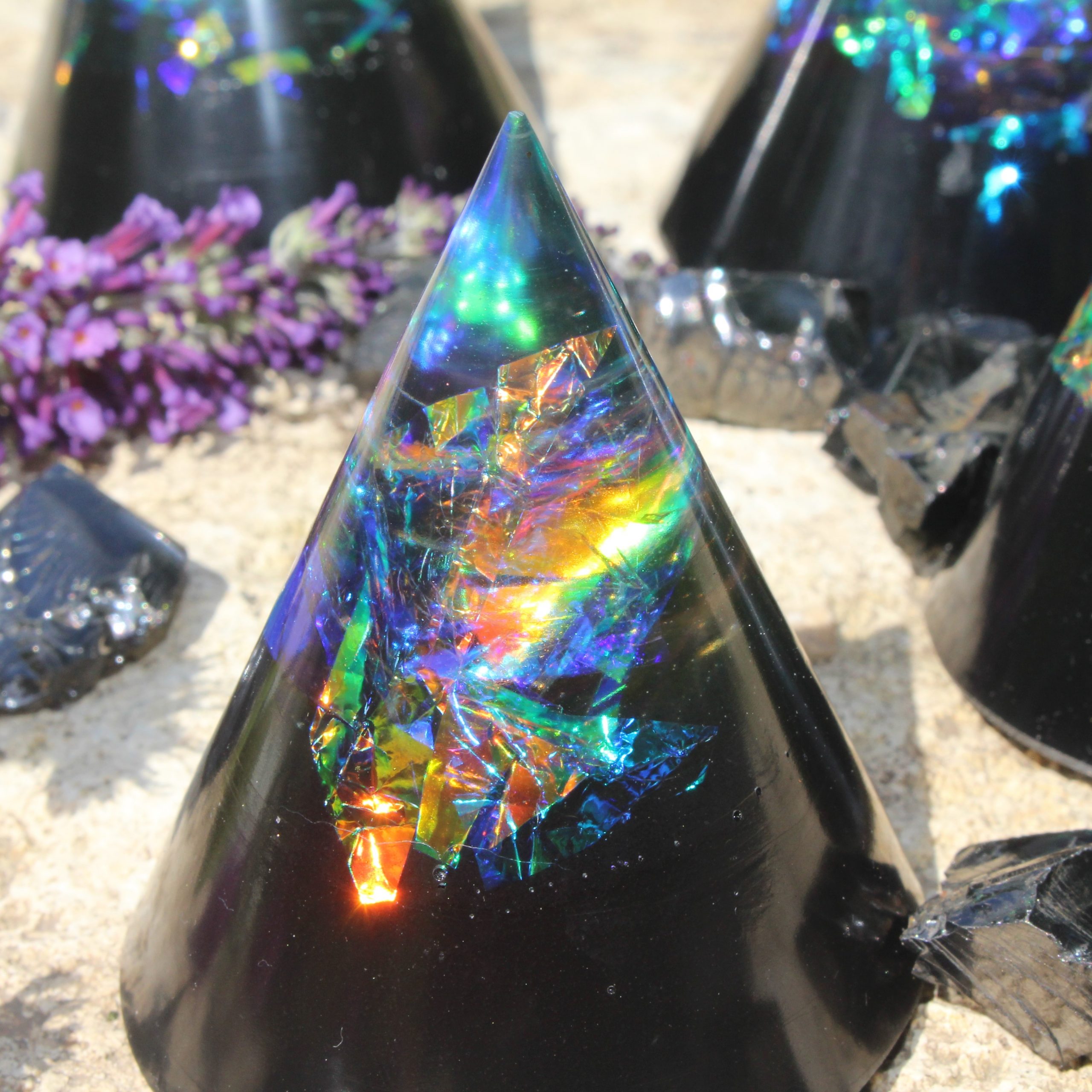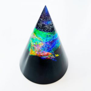 Rich is using a durable Epoxy Resin to create these magnificent little power houses, they are highly polished and come in its own beautiful pyramid gift box. These really are one of a kind, Stunningly decorated by us here at Oraphim with Dichroic effects that you can’t take your eyes off. Rich makes these in batches, with it being a creative process there’s always a little difference between them, we ask that you hold your hand above the cones to feel the little ‘wind’ that comes out.. this is the true piezoelectric electric & Shungite effect that is obtained by the process Rich makes them by.