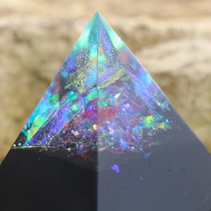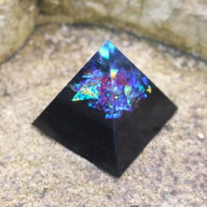 Rich is using a durable Epoxy Resin to create these magnificent little power houses, they are highly polished and come in its own beautiful pyramid gift box. These really are one of a kind, Stunningly decorated by us here at Oraphim with Dichroic effects that you can’t take your eyes off. Rich makes these in batches, with it being a creative process there’s always a little difference between them, we ask that you hold your hand above the pyramids to feel the little ‘wind’ that comes out.. this is the true piezoelectric electric & Shungite effect that is obtained by the process Rich makes them by. We have conducted human body electrical field kerlian photography experiments of our silver infused shungite, there is complete transformation in the lady’s electrical field.