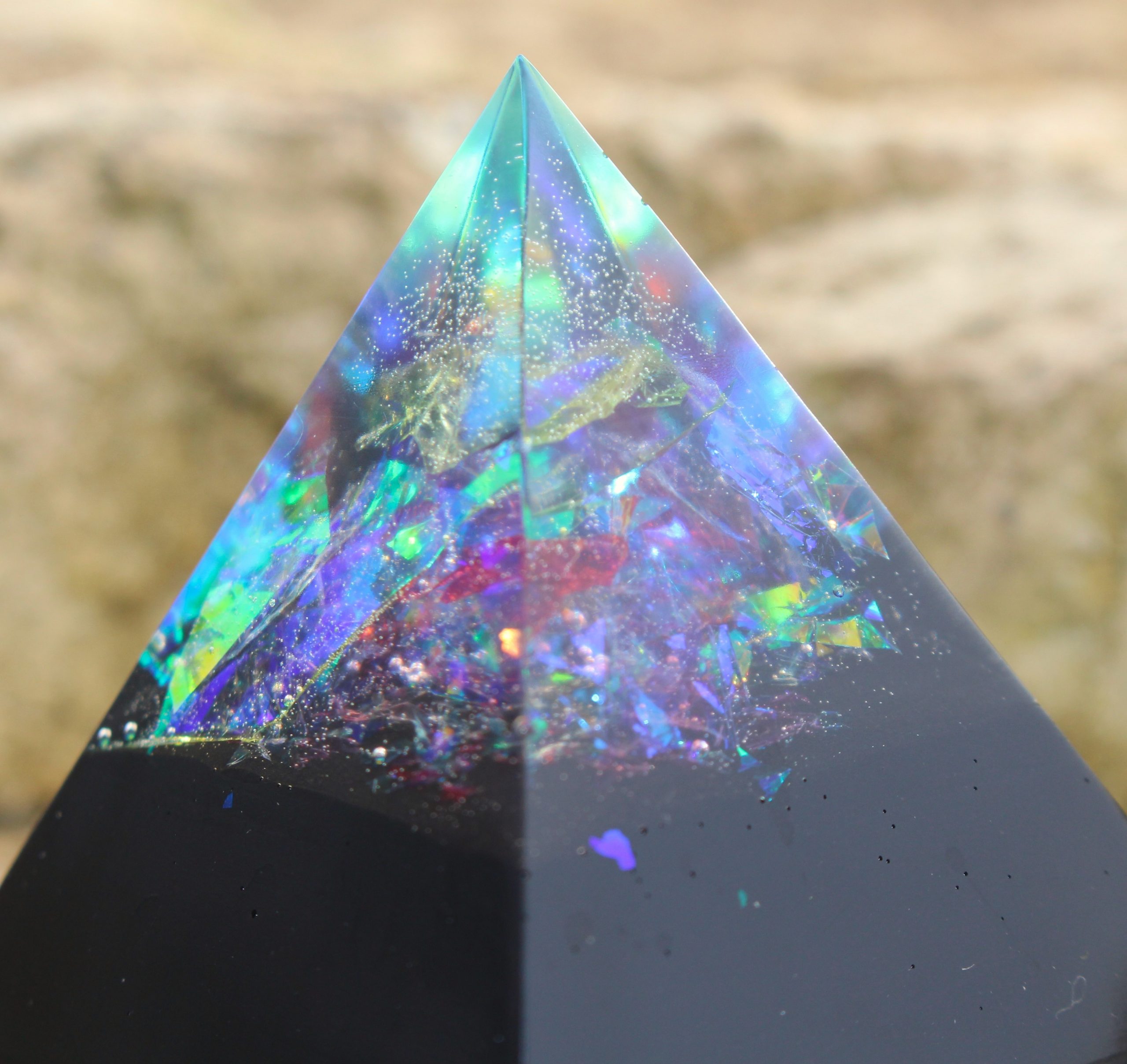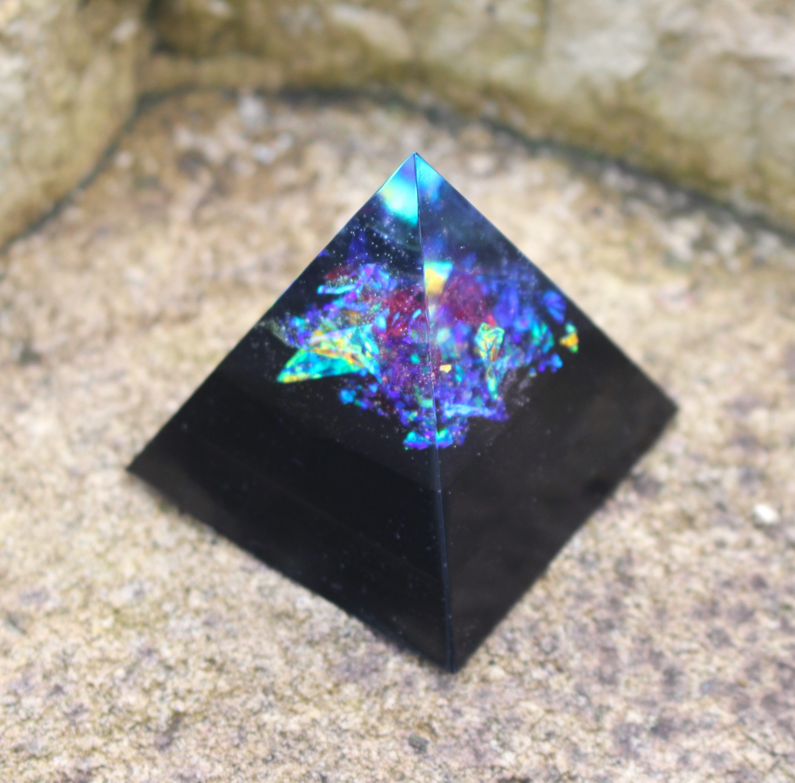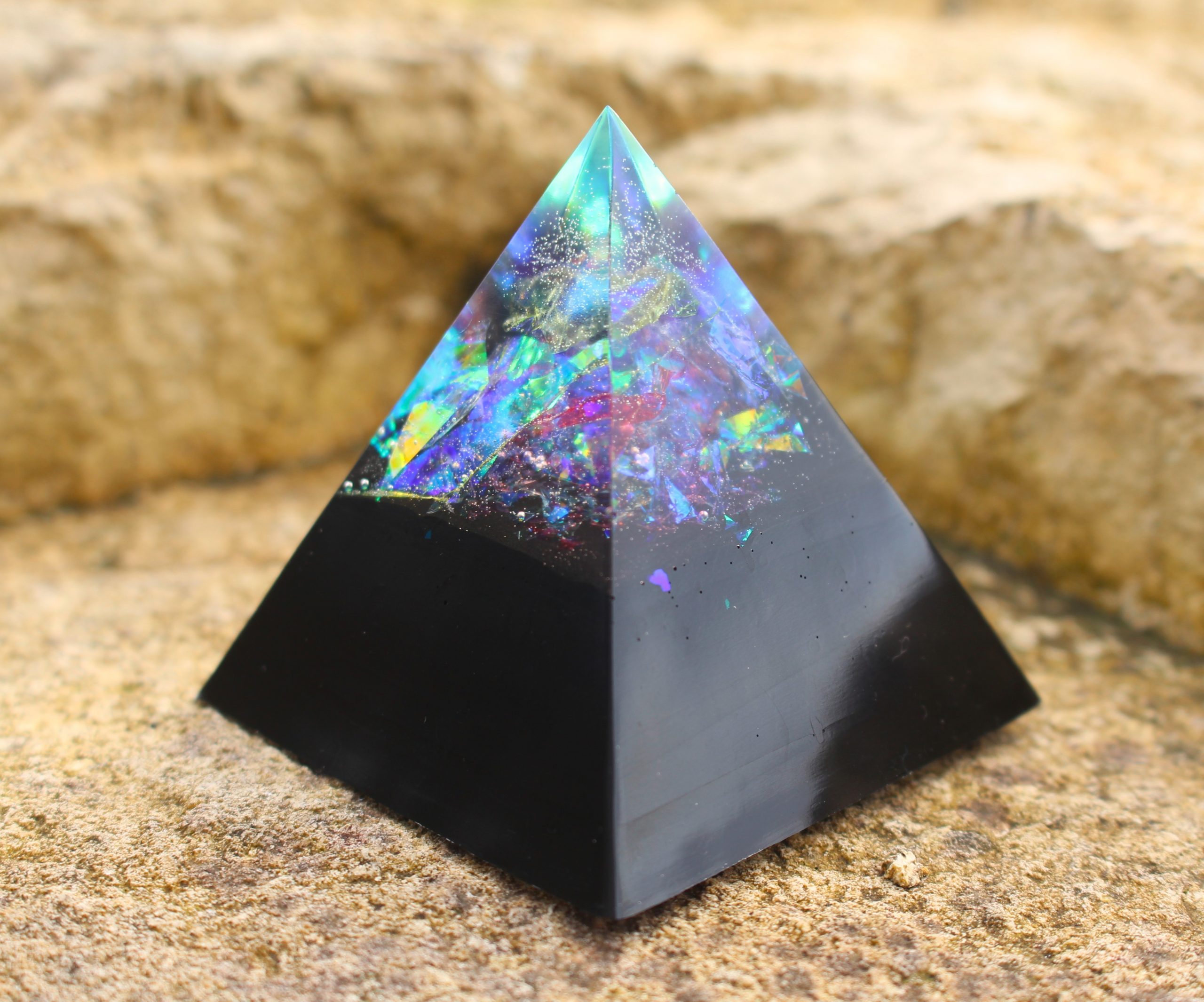 Beautiful Calming & Healing Pyramids Size: 6.5cm Tall with a base of 5.5cm square base sides: Mesmerizing and Powerful Quantum Meditating Aids, a true work of love and art, handmade by Oraphim, the Silver activated Shungite powder is in the base of the pyramid with the dichroic decoration in the top, these are cast in resin.