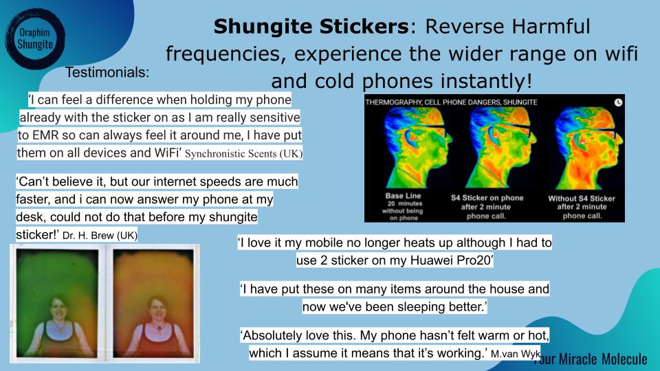 Shungite attenuates the left hand spinning Emf, which even result in your handset not getting hot anymore, it’s nice to feel that something has actually changed these frequencies, which these stickers do, and with the thurmography results from Nancy Hopking there’s much less heat in the head also.